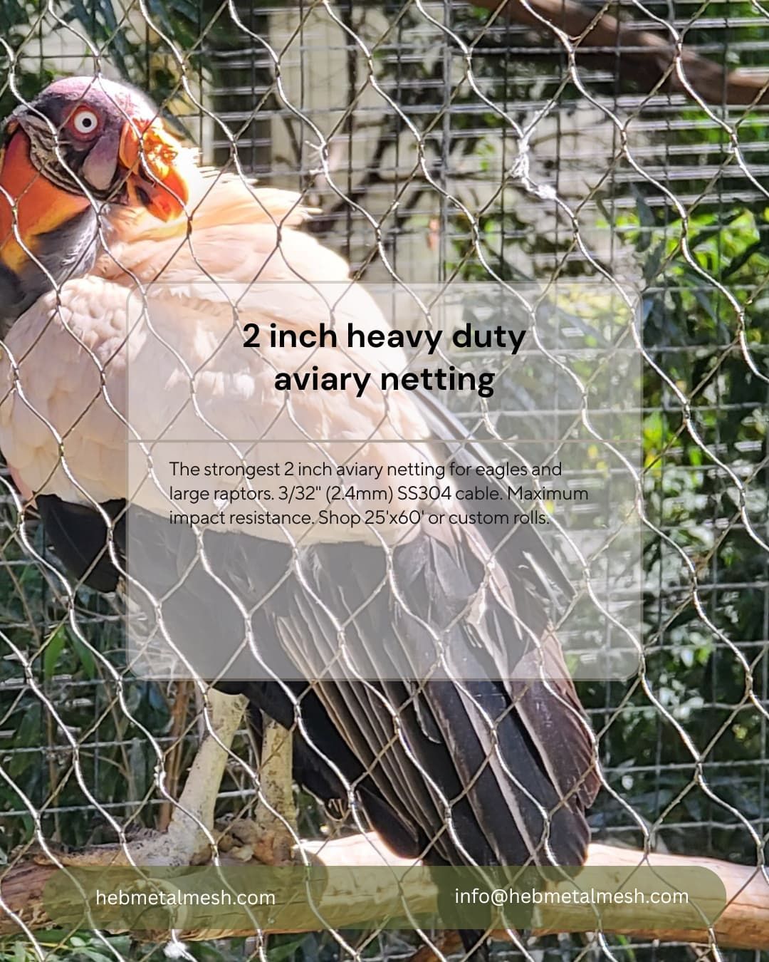 Large birds of prey like Bald Eagles, Golden Eagles, and Andean Condors possess incredible flight speed and physical power. Our 2″ x 2″ x 3/32″ handwoven stainless steel mesh is the professional choice for these species. The 3/32″ (2.4mm) cable diameter provides a breaking strength far superior to standard aviary wire, ensuring that even the most powerful wing impacts are safely absorbed without compromising the enclosure.